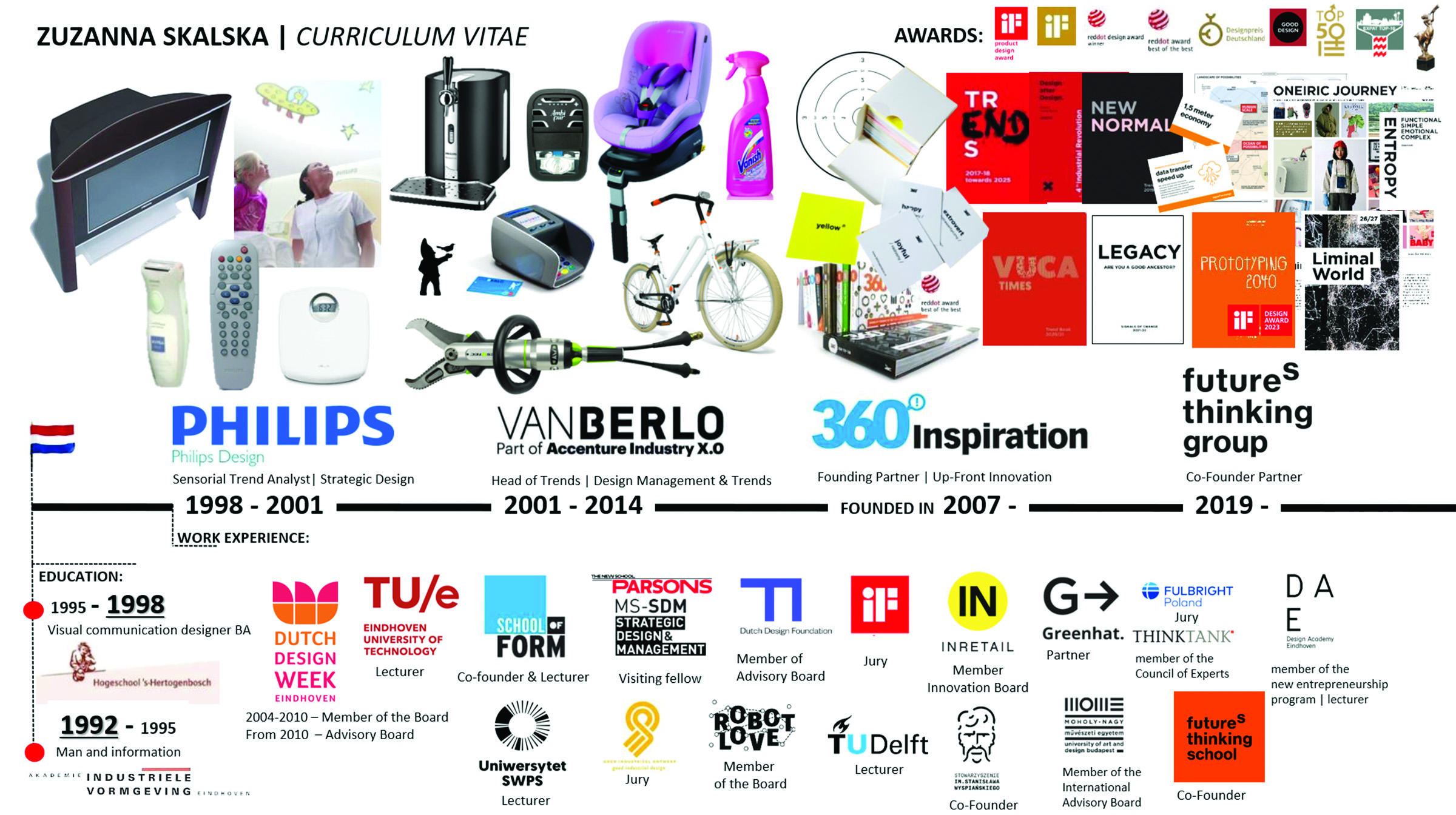 Zuzanna started her career in 1998 at Philips Design and for years she contributed with SignalS of Change analyses to international visionary design projects. Then for almost 15 years she was involved in Design Management & Trends consultancy at a leading Dutch design agency (today part of Accenture Industry X.O). Since 2014 she has been a founding partner of 360Inspiration, working for clients from various industries, including many blue chips and market leaders. Zuzanna’s core expertise areas include Up-Front Innovation, Industry’s Cross-fertilization, SignalS of Change and Strategic FutureS Thinking. Her research and consulting activities concentrate on 8 crucial industry fields: CE, DAP, Home, Healthcare, Mobility, FMCG/Retail, Urban and Finance. She works closely with CEOs and decision makers on strategic scenario’s development as well with R&Ds/in-house creative teams on specific projects. With almost 25 years of experience Zuzanna skillfully translates her knowledge into actionable innovative programs, using many of her own, self-developed tools.